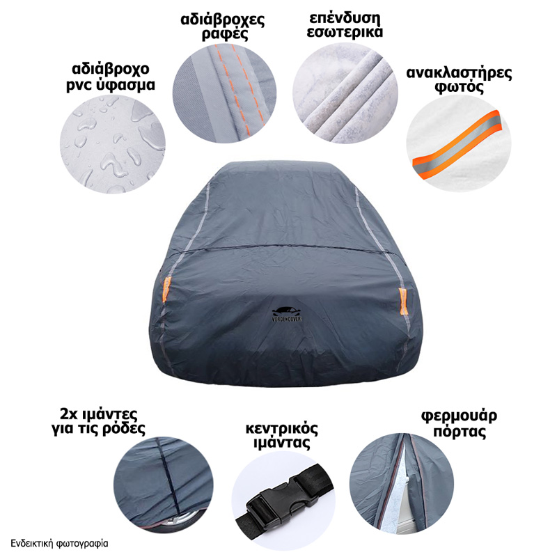 - Η κουκούλα αυτοκινήτου Vordencover από αδιάβροχο ύφασμα pvc σκούρο γκρι χρώματος με εσωτερική βαμβακερή επένδυση προστατεύει το αυτοκίνητο από ήλιο, σκόνη, βροχή, χιόνι και γρατζουνιές. Η υψηλή θερμοαντοχή της και η προστασία της στις UV ακτίνες προστατεύουν το χρώμα του αυτοκινήτου στον ήλιο.